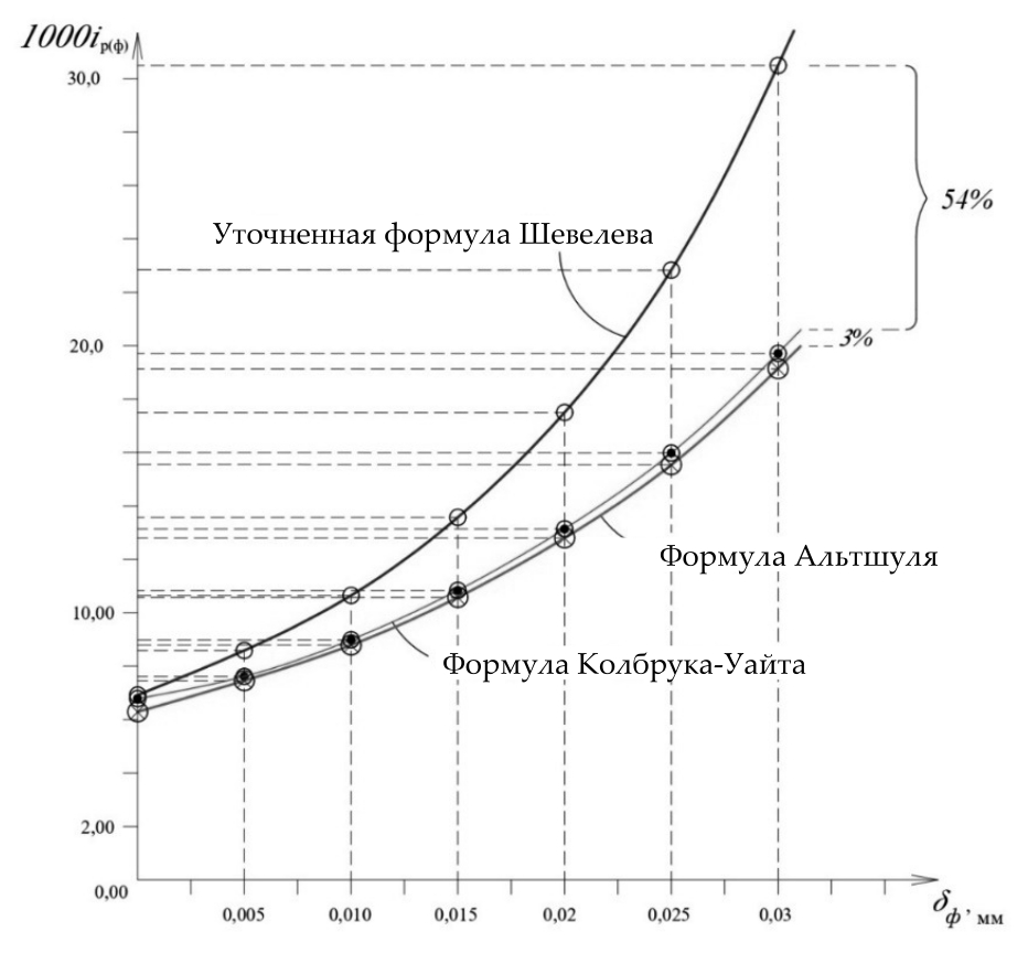 Анализ значений гидравлических характеристик труб, представленных в табл. 1‒3, и графиков зависимостей 1000 i = f(δф) на рис. 2, позволяет сделать следующие выводы: