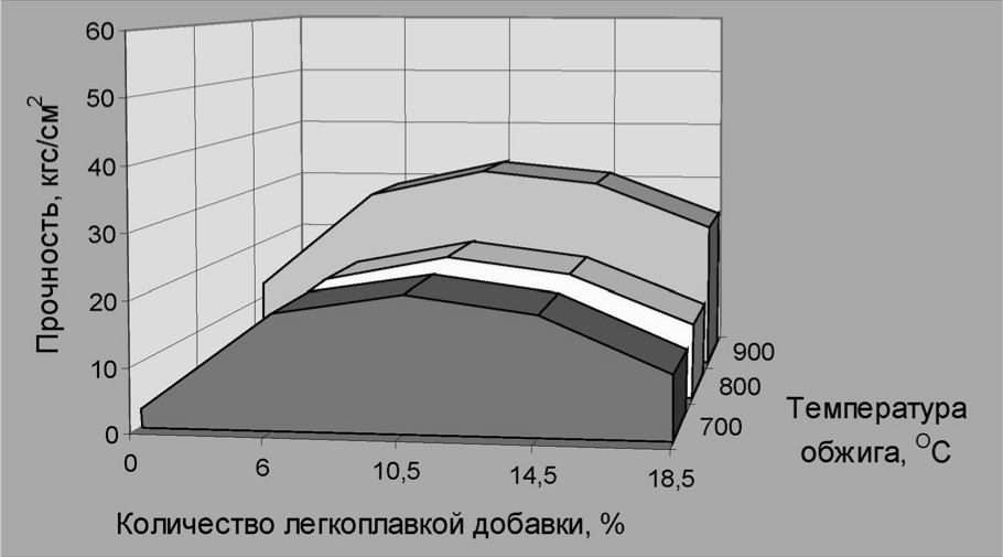 На основании статистической обработки результатов планирования эксперимента было получено полное квадратичное уравнение регрессии с доверительной вероятностью 0,9. По уравнению определены зависимости изменения прочности от количества добавки и температуры обжига. На рис. 1 видно, что наибольшая прочность характерна для состава, содержащего 10,5 % легкоплавкой добавки при температуре обжига 900 °С. Прочность всех исследуемых составов, обожженных при более низких температурах (700 и 800 °С), значительно ниже. Полученные зависимости можно объяснить количеством образующегося расплава. При введении добавки менее 10,5 % количество эвтектического расплава мало для вовлечения в расплав остатков исходных фаз и для образования прочного каркаса. При увеличении количества добавки более 10,5 % при обжиге образуется слишком много стеклофазы, которая, не успев закристаллизироваться при обжиге, создает непрочную связку.