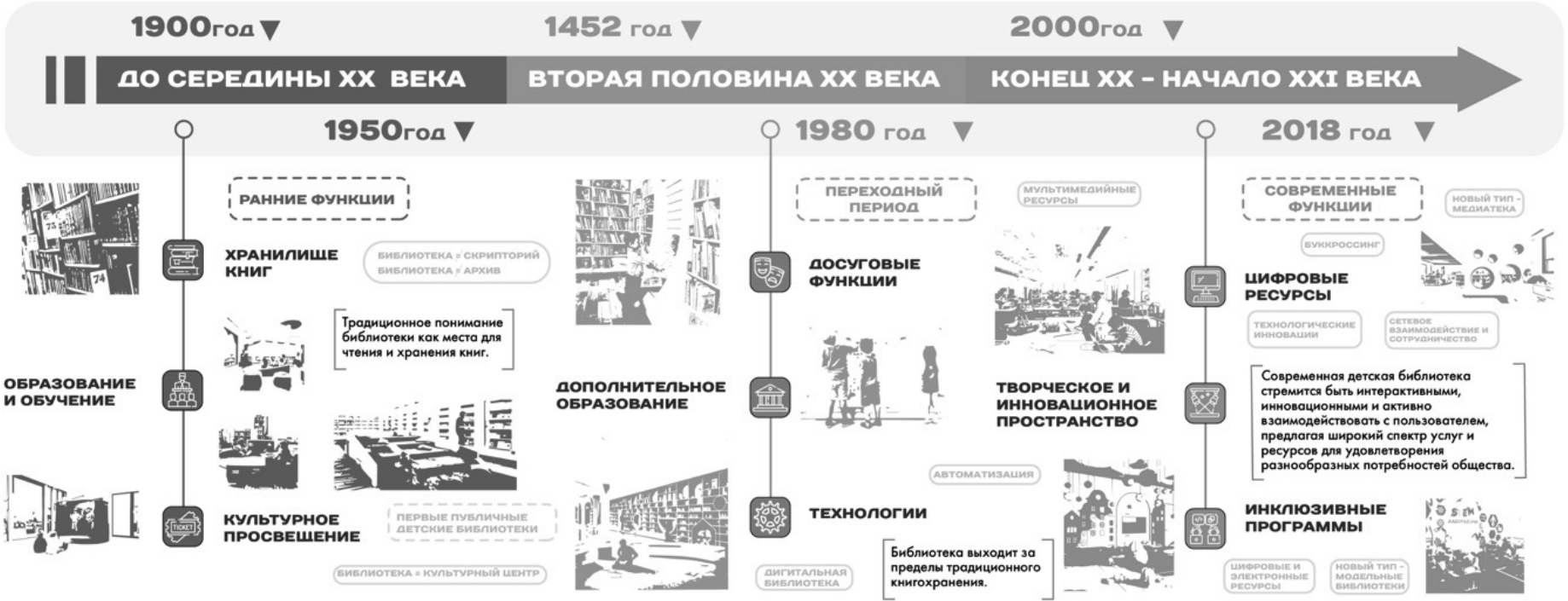Итак, можно проследить, как за один век функции детских библиотек эволюционировали от традиционного хранения книг и культурного просвещения к более комплексным и разнообразным ролям, включая цифровое обучение, творческое развитие и социальную интеграцию [4].