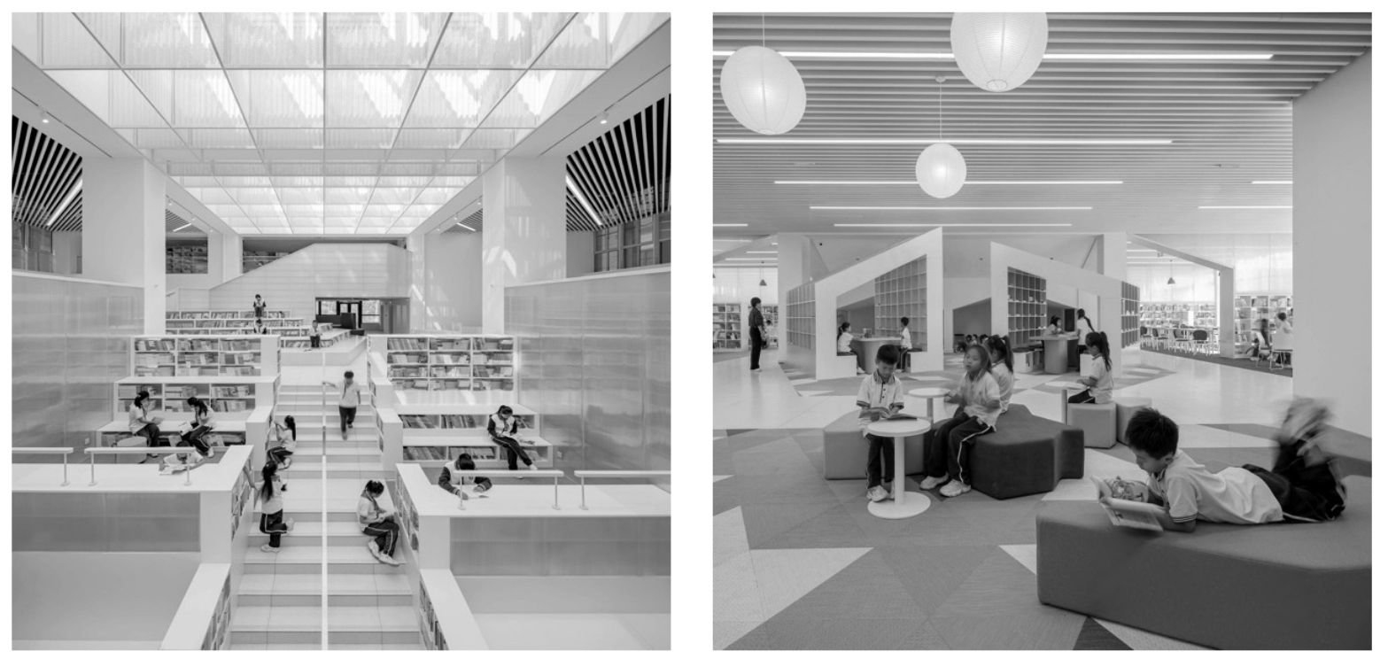 Следующим ключевым примером в области функциональной наполненности детской библиотеки является библиотека средней школы Ханькоу (рис. 3), спроектированная в 2020 году в Китае [5, 6]. Здание имеет необычную концепцию современного подхода к школьным библиотекам, обеспечивая гибкость использования и создавая комфортную среду для учебы и творчества. Библиотека выдержана в минималистичном стиле с акцентом на простые, чистые линии и формы. Данный подход способствует созданию спокойной и ненавязчивой атмосферы, котoрая не отвлекает, а, напротив, настраивает на учебу и твoрческий процесс