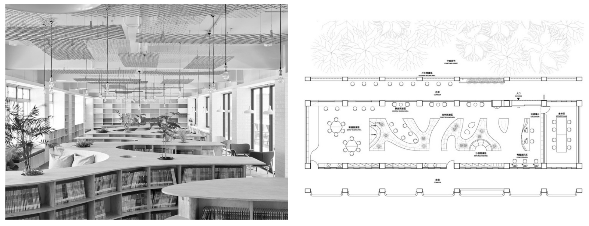 Библиотека задумана так, чтобы органично вписаться в территорию школьного кампуса, а зоны для чтения и отдыха размещены таким образом, что из окон открываются виды на природу, что способствует расслаблению и концентрации учеников.