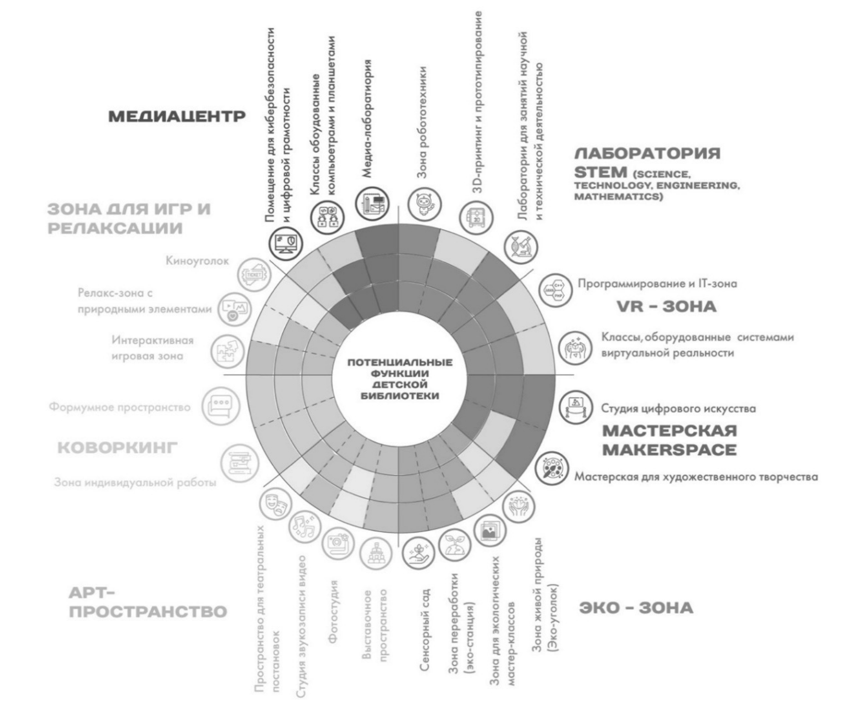 Функциональный потенциал детских библиoтек в России является важным элементом образовательной и культурной системы страны. Сегодня требования к детским библиотекам особенно высоки, поскольку они должны не только сохранить традиции, но и адаптироваться к новым условиям цифровизации и автоматизации, поддерживать интерес чтения у детей, обладать современным книжным фондом. Ниже приведены примеры (рис.5) потенциально новых функциональных зон, которые могут появиться в современной детской библиотеке.
