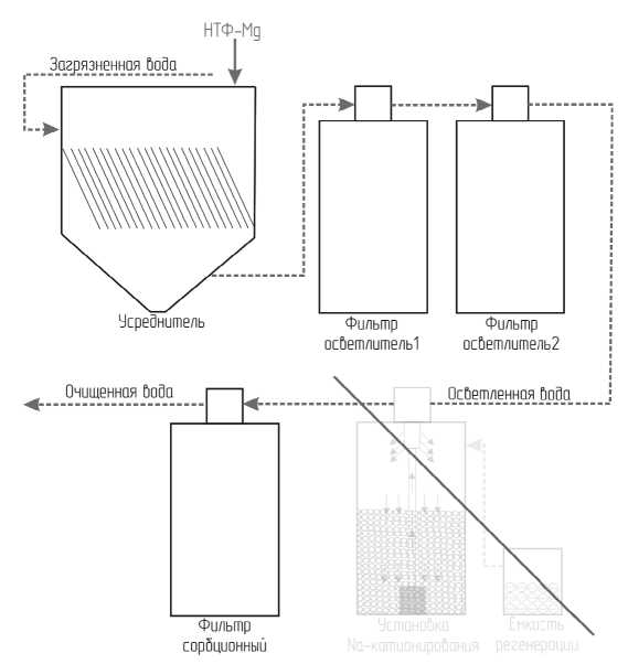 По технологии, разработанной ООО «Бантер Групп», осветленная сточная вода после прохождения через осветлительные фильтры направляется на дальнейшее умягчение с использованием Na-катионового фильтра (рис. 1).