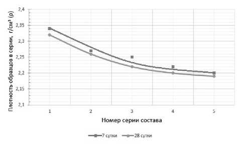 Рис. 1. Зависимость средней плотности образцов от серии на 7-е и 28-е сутки твердения