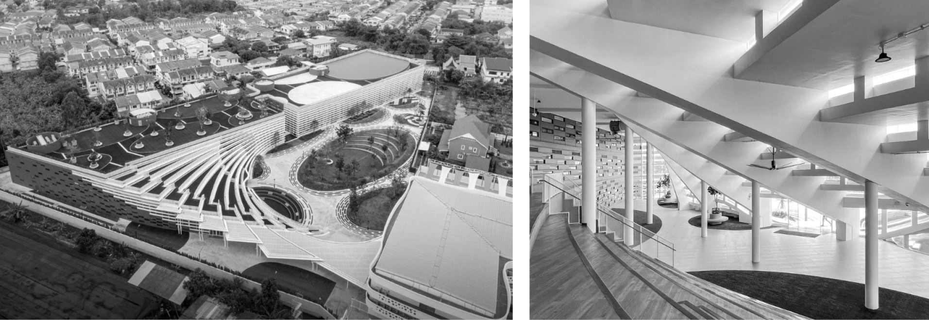 Концепция многофункциональности распространяется не только на внутреннюю структуру школьного здания, но и на внешнюю среду, пришкольную территорию. Ярким примером подобного решения выступает Школа SISB в Таиланде (рис. 4). Крыша в этой школе сформирована зелеными ступенями-террасами, которые, формируя единое композиционное и ландшафтное решение, выступают в качестве различных зон спокойного и активного отдыха, приспособлены для различных видов обучения и творческой деятельности [14].
