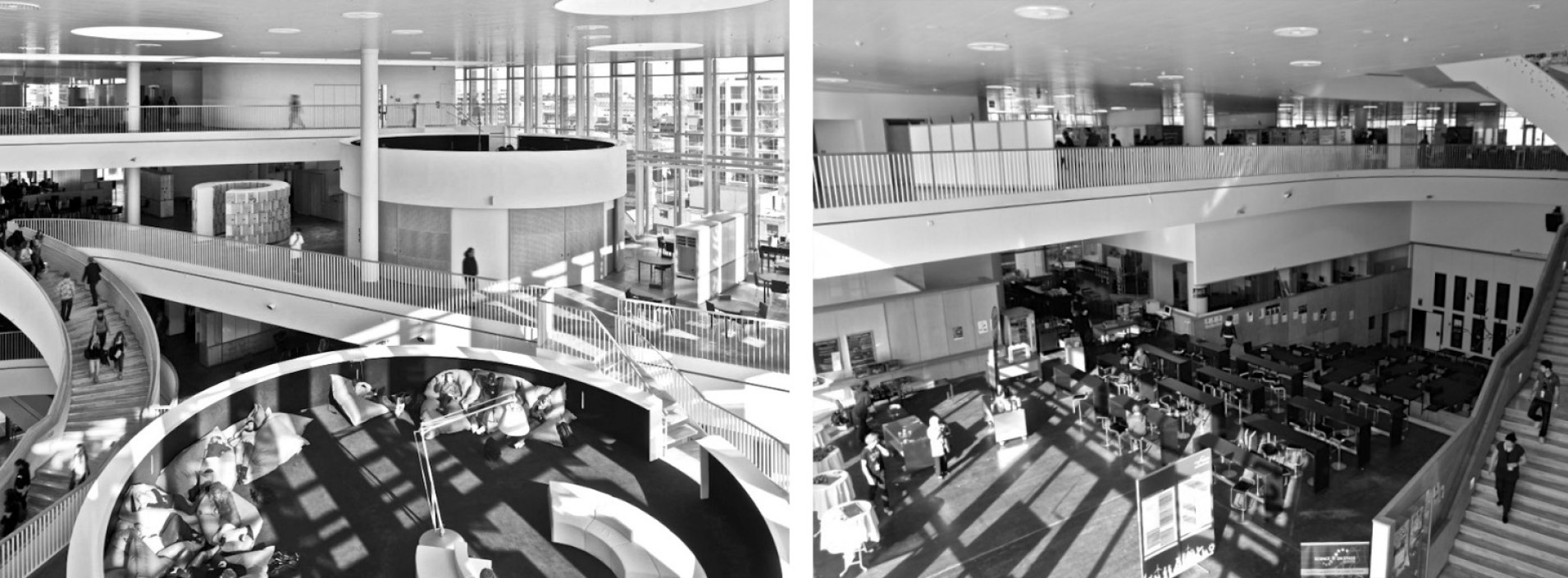 В «Летово» (школа-пансион в Москве) (рис. 2) основная школьная рекреация – это сложное, трансформируемое пространство. Оно может быть местом для проведения школьных мероприятий, актовым залом, трансформироваться в небольшую изолированную аудиторию. Зимний сад и лестница-амфитеатр выступают основными связующими элементами между этажами здания [12]. По сути, многоуровневые и многофункциональные атриумы, из которых по необходимости «вычленяются» пространства нужного формата, стали знаковым местом всех проектируемых в последние годы школьных зданий. Создание открытых пространств для учебы и отдыха поможет ребенку осознать себя частью большого коллектива, общества. В некоторых зарубежных школах, например в датской школе, построенной по проекту 3XN, от пространственного выделения классов вообще отказались (рис. 3). Большая часть уроков проходит в общедоступных пространствах, где дети занимают места на ступенях лестниц, вдоль галерей и в удобных лаунж-зонах [13].