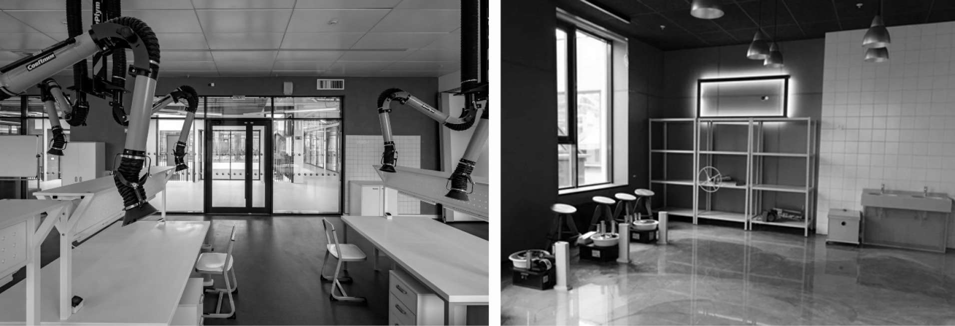 Примером может выступать Образовательный центр «Холст» в Москве (рис. 7). В школе предусмотрены классы для занятий химией и биологическими опытами с установкой современного технологического оборудования. Для данного оборудования необходим подвод большого количества инженерных коммуникаций (отводы систем вентиляции от местных отсосов, подвод сжатого воздуха и газа и т. п.).
