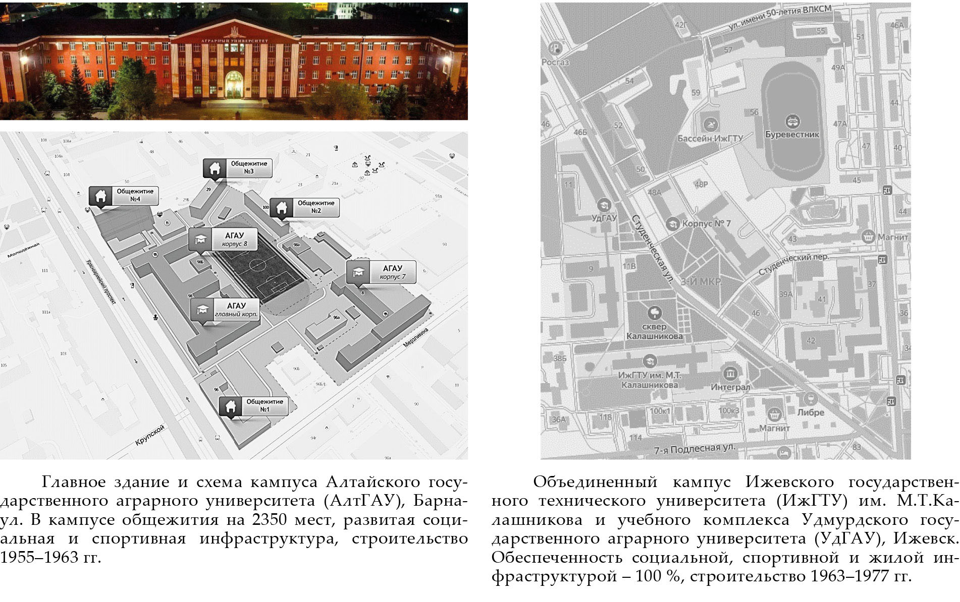 Рис. 2. Характерные примеры кампусов региональных вузов, тесно связанных с промышленным комплексом региона и страны