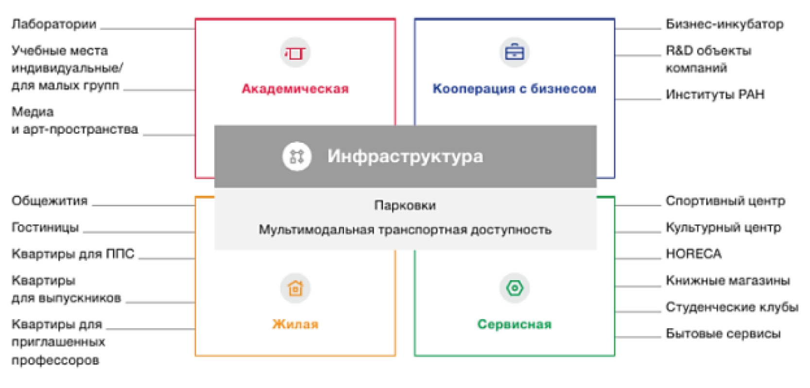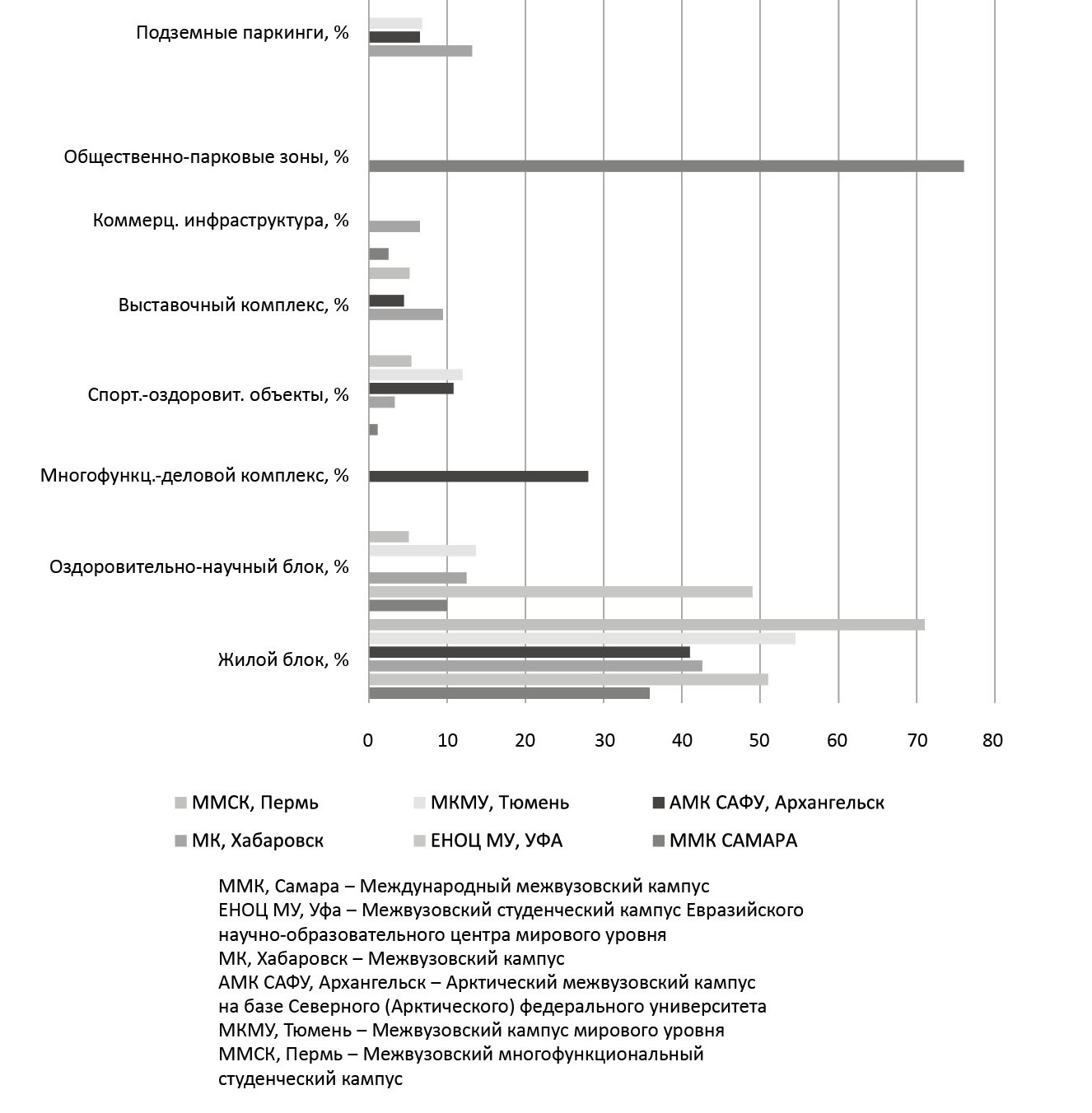 Многофункциональность межуниверситетского кампуса отражена в директивных документах, направленных на упорядочение механизмов и инструментов создания кампусов. В [10] как необходимое условие критериев отбора для строительства кампуса указывалось наличие как минимум 13 функциональных зон: жилье, образование, библиотечный комплекс, объекты здравоохранения, спорта, досуга, культуры, торговли, общественного питания, социального и коммунально-бытового назначения, коммерческой предпринимательской деятельности, стоянок и резервных территорий.