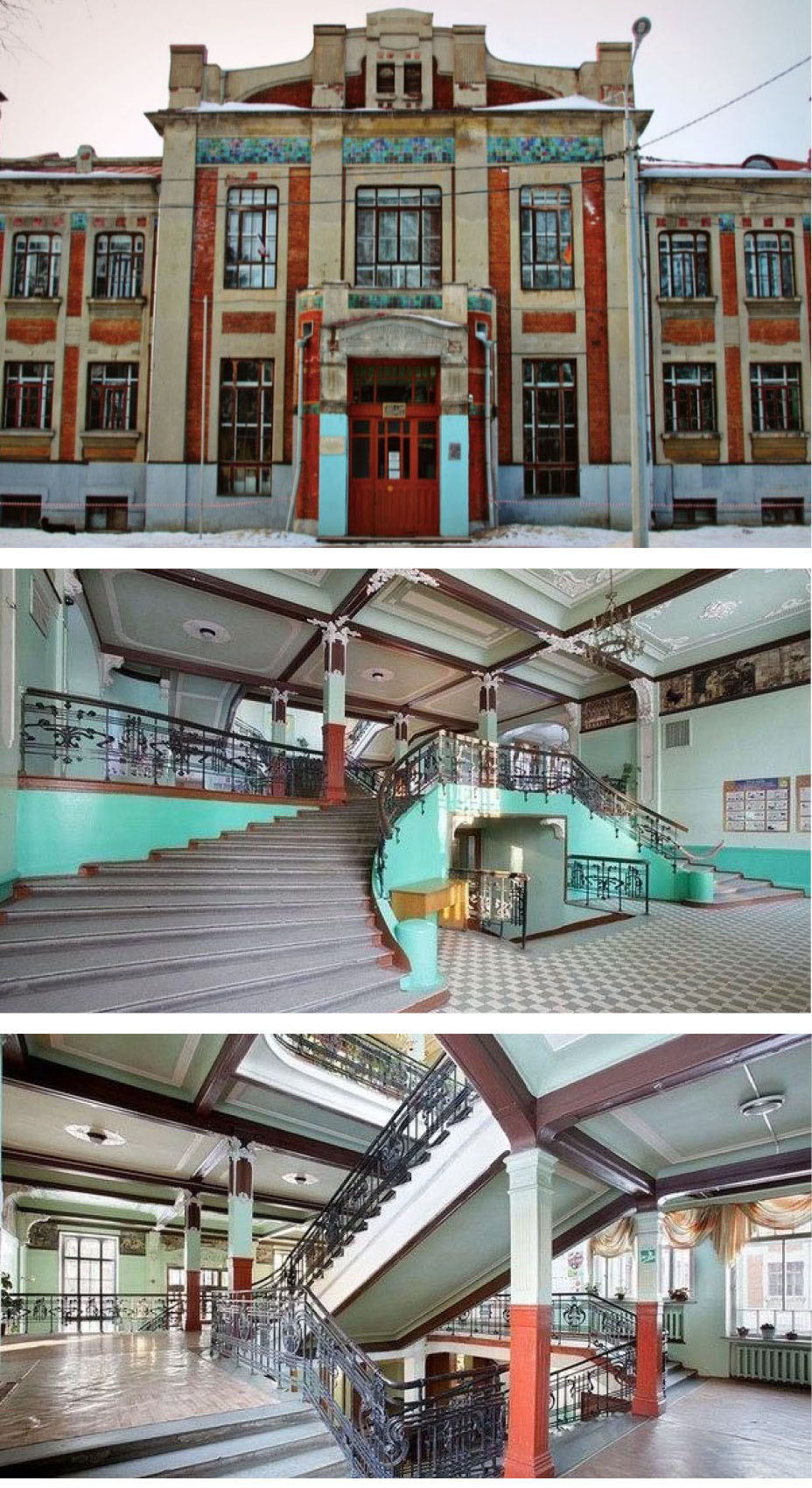 Fig. 2. Building of a two-class factory school for children of shop workers at the Bogorodsko-Glukhov Manufactory of Arseny Morozov (modern school No. 10 in Noginsk, Moscow Region), Architects A.M. Markov, Karasev. 1908 г. Photos of fragments of the main facade and interiors [10]
