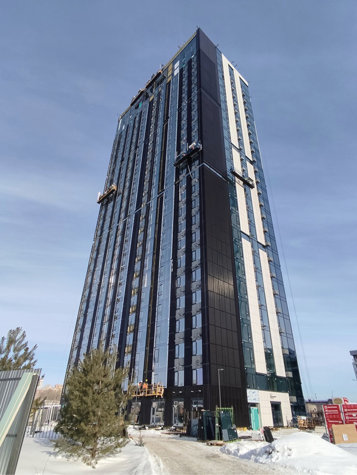 Одним же из самых масштабных проектов в России по строительству жилых домов с интегрированными солнечными панелями является ЖК «Умный дом Гелиос» в Уфе (рис. 5). Суммарная мощность солнечного фасада, направленная на работу лифтов, освещение холлов, лестничных площадок и работу домофонов, превышает 180 кВт [11].