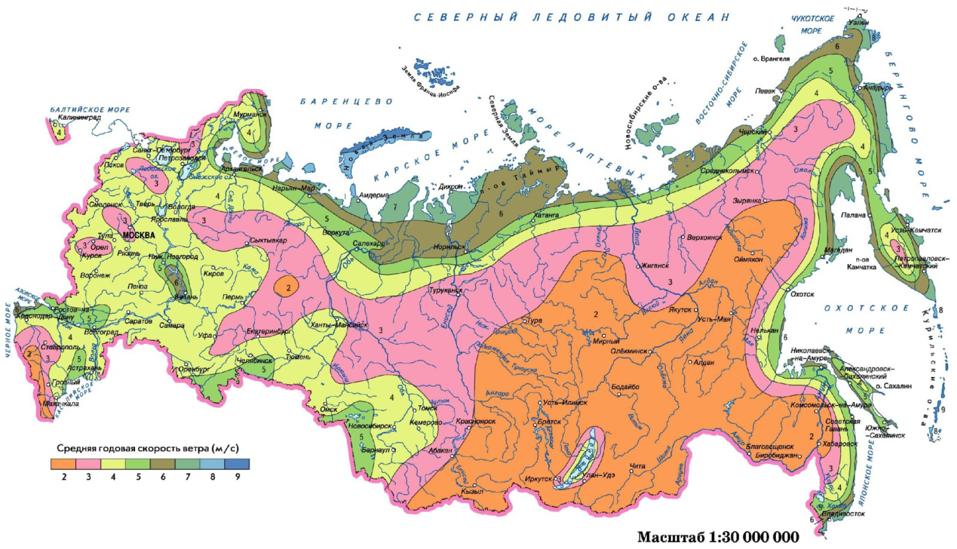 - определить среднюю скорость ветра (выбирается на основе карты ветров (рис. 7) [14], для Ижевска равна 4,5 м/с [15]);