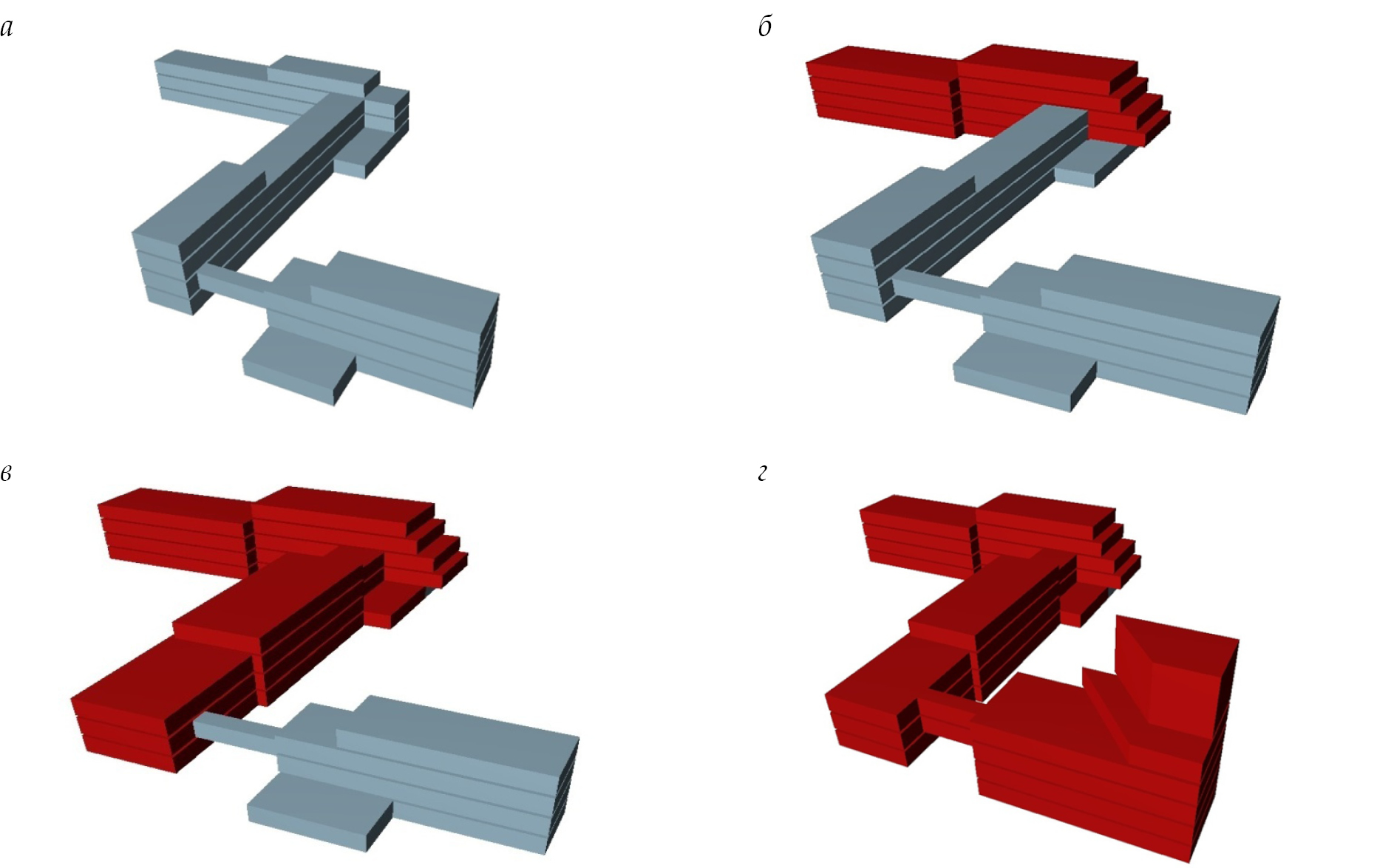 а ‒ исходная структура зданий медицинского объекта; б ‒ начальная стадия строительства новых корпусов; в ‒ продолжение реконструкции; г ‒ окончание реконструкции