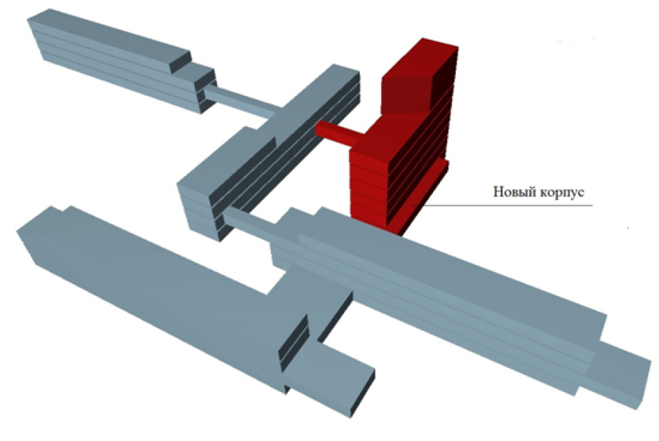 На территории Российского онкологического научного центра имени Н.Н. Блохина при реконструкции применяется принцип сочетания реконструкции с новым строительством на резервной площадке, называемый иногда реновацией или переустройством [12]. При этом вновь возведённые объекты естественным образом становятся самыми технологичными и передовыми в лечебном учреждении, создают новую базу в развитии науки и технологии с привлечением самых передовых достижений в области медицины. Кроме этого, подобные объекты могут быть опорными объектами для проведения дальнейшей реконструкции всего объекта в целом. Появление дополнительных площадей позволяет освобождать необходимые участки для поэтапной реконструкции всего учреждения. Схема реконструкции со строительством нового корпуса приведена на рис. 4.