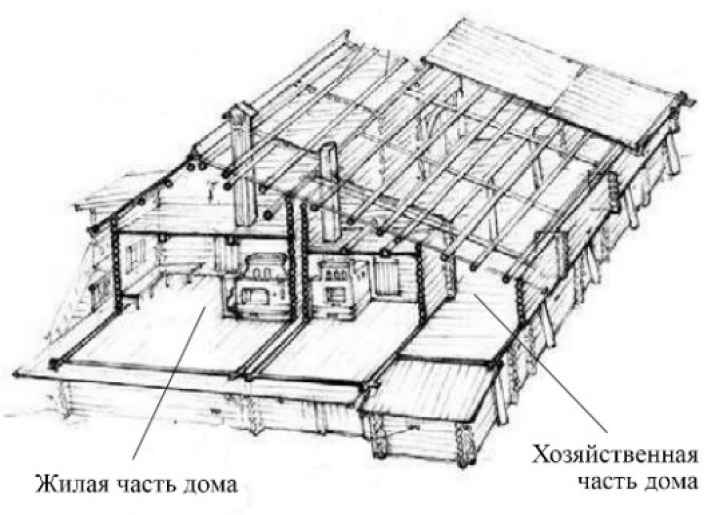 Дом «брусом» Дом длинный узкий, части строения расположены друг за другом: жилая с боковым крыльцом, хозяйственный двор, сарай или дровня. На многих домах ‒ выпускное окно на крыше («вышка») в жилое летнее помещение либо часть повети | ||