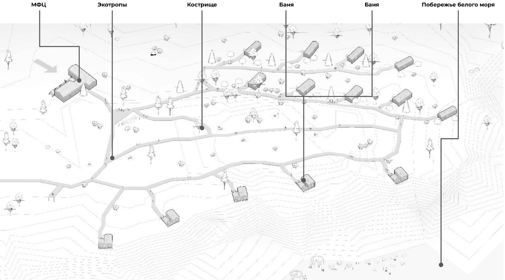 Fig. 5. Project proposal for a tourist complex in the village of Vorzogory (authors S. Trebis, I. Rezaykin, I. Petchenko, S. Kuzmina, A. Vikarchuk)
