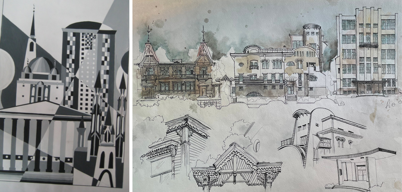 Рис. 10. Итоговое проектное задание на тему «Город Самара». Линейное и тонально-пятновое решение композиции