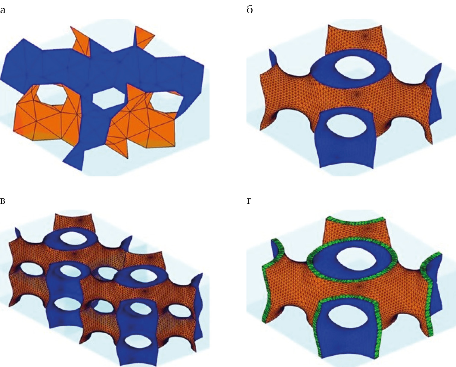 2) Обработка: модели ТПП подвергаются пространственной корректировке, сглаживанию и утолщению (рис. 3) с использованием алгоритмов Porous 3D [12], а итоговый результат, т. е. цифровой двойник пористого материала, экспортируется в формате «*.stl» для дальнейшего использования. Пространственная корректировка подразумевает алгоритм трансляции модели. Для симуляции бесконечности ТПП метод трансляции аналитически реализует параллельный перенос в прямоугольной системе координат, обеспечивая бесшовное соединение границ между соседними элементарными ячейками каркаса ТПП. Алгоритм сглаживания граней сочетает метод Лапласса и метод оптимизации, минимизируя абсолютное значение разности между максимальным и минимальным значениями средней кривизны в каждой точке ТПП, что позволяет достичь сглаживания, подобного ТПМП. Алгоритм утолщения поверхности создаёт объёмные структуры путём смещения копии поверхности на заданную толщину.