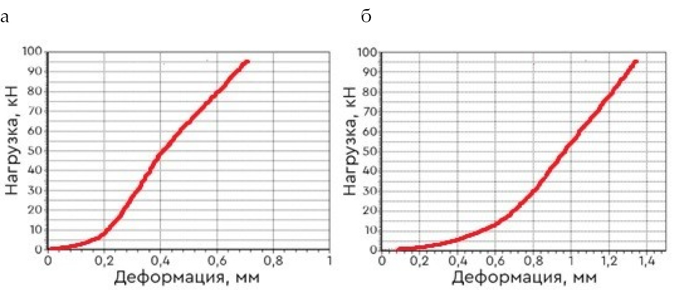 Рис. 6. Графики хода нагружения до 95 кН с фиксацией деформации при испытании на сжатие: a ‒ контрольный образец; б – образец с каркасом