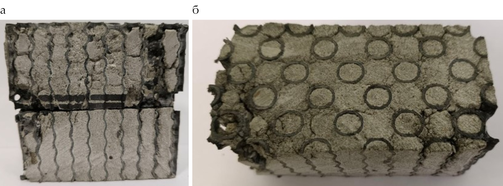 Рис. 8. Внутреннее наполнение ТПП-каркаса самоуплотняющимся цементным раствором в твердом состоянии (взят образец, который подвергался разрушению при определении прочности на сжатие): а – по направлению заливки, вертикально; б – в горизонтальной плоскости, т. е. перпендикулярно заливке раствора