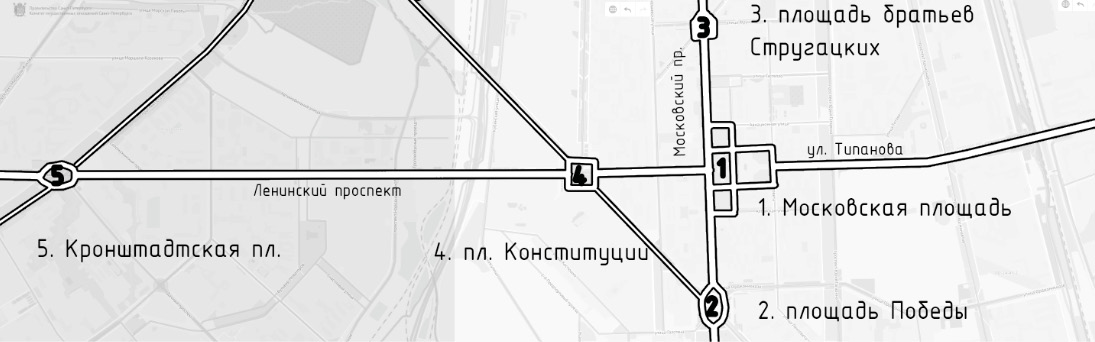 Рис. 6. Фрагмент системы градостроительных центров вдоль Московского и Ленинского пр. и ул. Типанова в Санкт-Петербурге, 2025 г. (авторская схема)