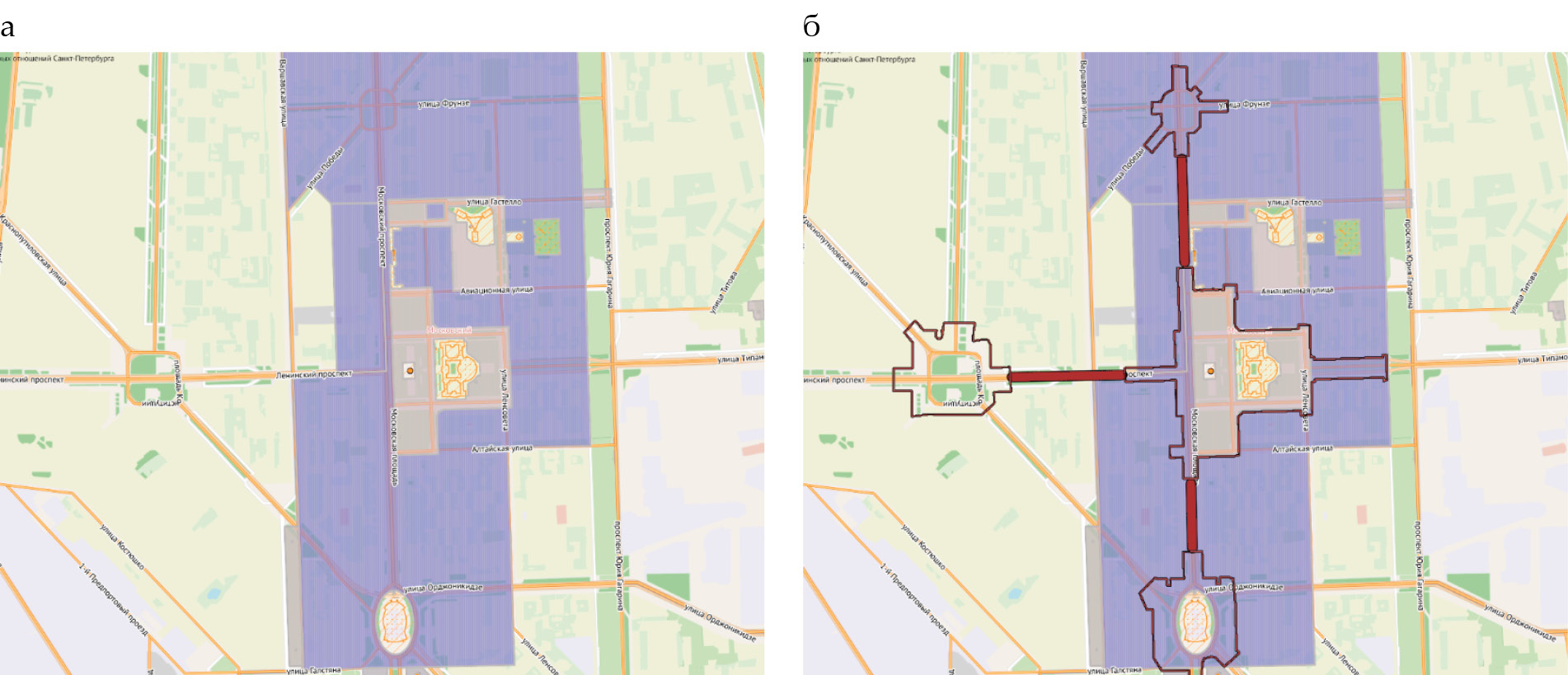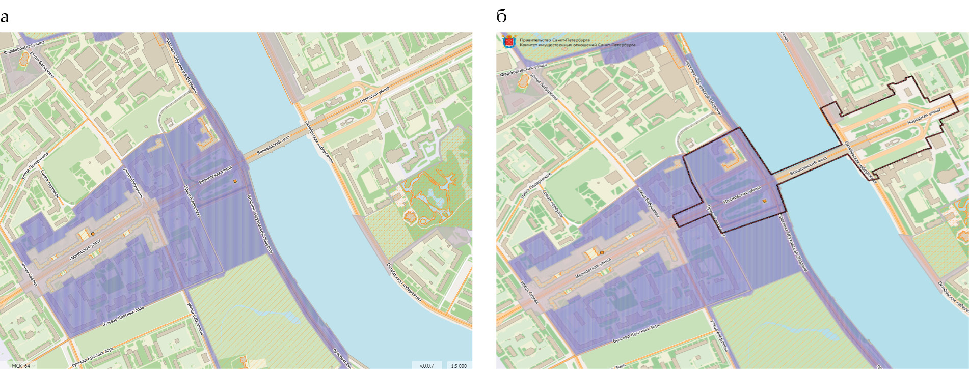 Общественный центр Кировского (Московско-Нарвского) района. Общественный центр Кировского района, включающий ансамбль площади Стачек, Кировской площади, застройки вдоль проспекта Стачек, ансамбль жилой застройки Тракторной улицы, является наиболее полно сформировавшимся и реализованным. Все основные элементы застройки этого общественного центра являются объектами культурного наследия, а его территория в выявленных границах является объединенной охранной зоной. Границы общественного центра Кировского района во многом совпадают с границами территории объектов культурного наследия. Таким образом, целостность общественного центра защищена на законодательном уровне (рис. 11, а). Дальнейшее уточнение может включать в себя работу с границами отдельных зданий, например дома Технической учёбы, жилой застройки вдоль проспекта Стачек и др. (рис. 11, б).