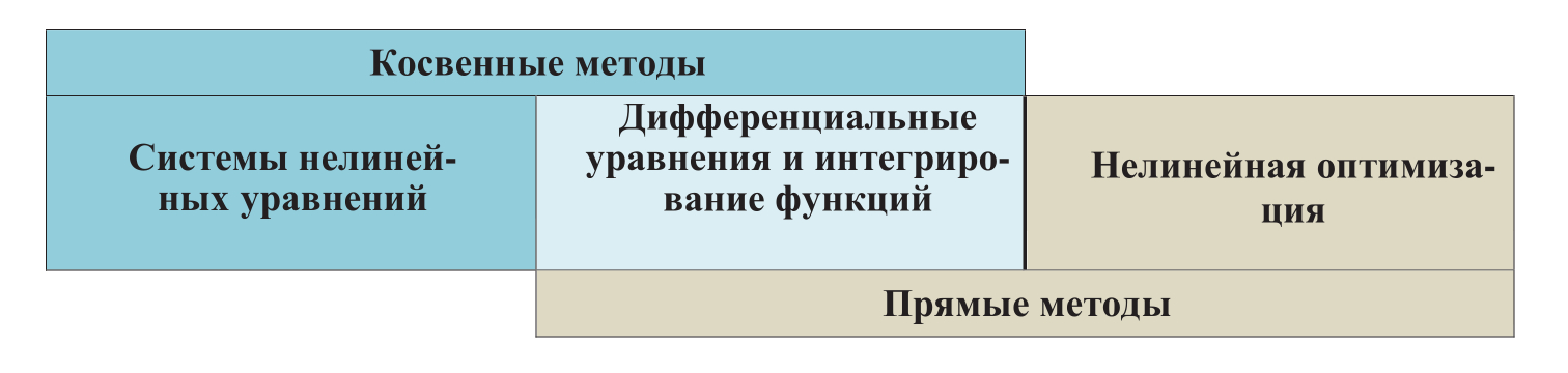 На рисунке показаны три основных компонента оптимального управления и класс методов, использующих каждый компонент. Понятно, что как косвенные, так и прямые методы используют дифференциальные уравнения и интегрирование функций, тогда как косвенные методы используют системы нелинейных уравнений в отличие от прямых методов, которые используют подходы нелинейной оптимизации.