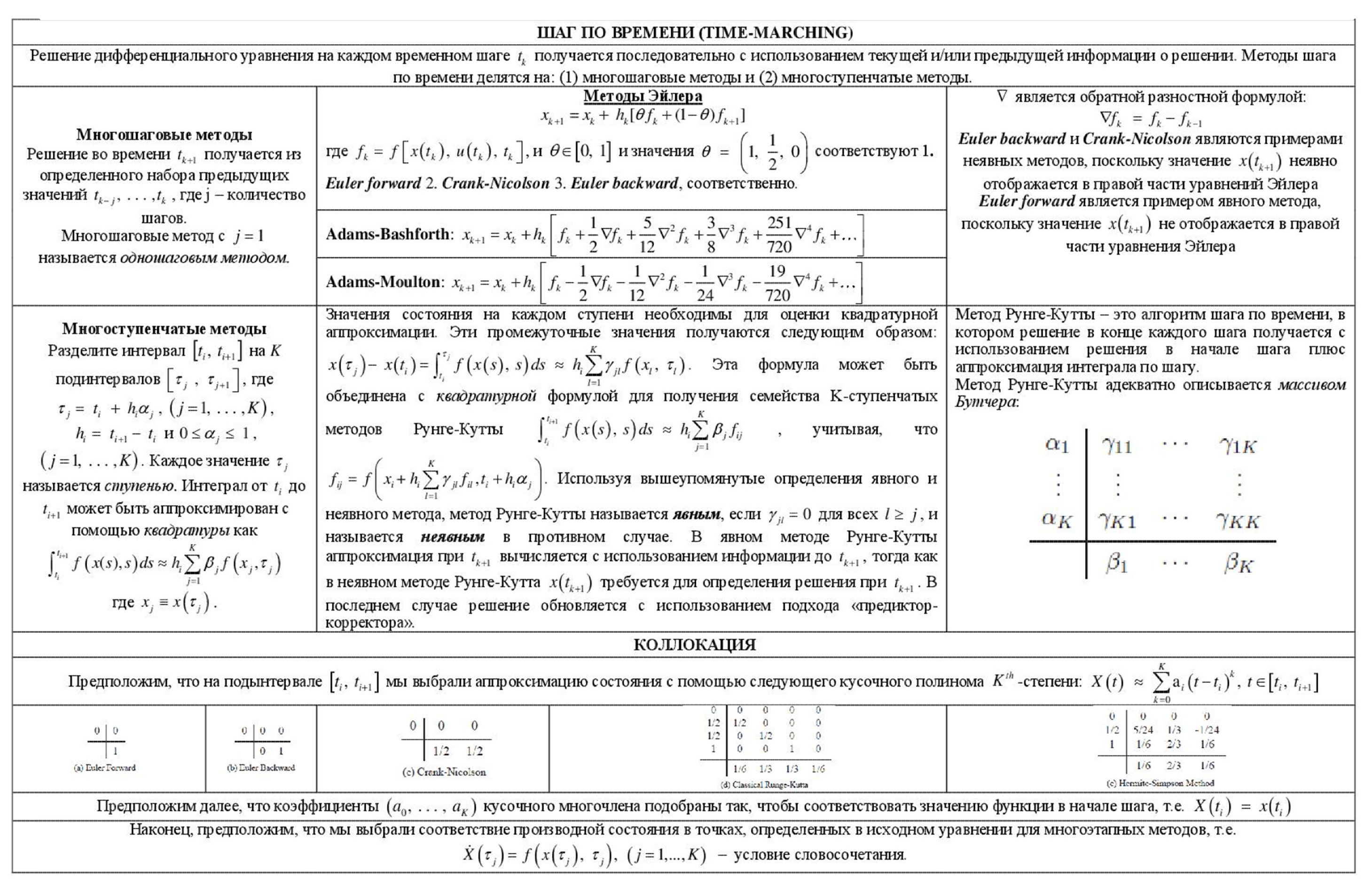 Существует два подхода к решению дифференциального уравнения: шаг по времени (time-marching) и коллокация. В таблице ниже представлены основные характеристики этих подходов.