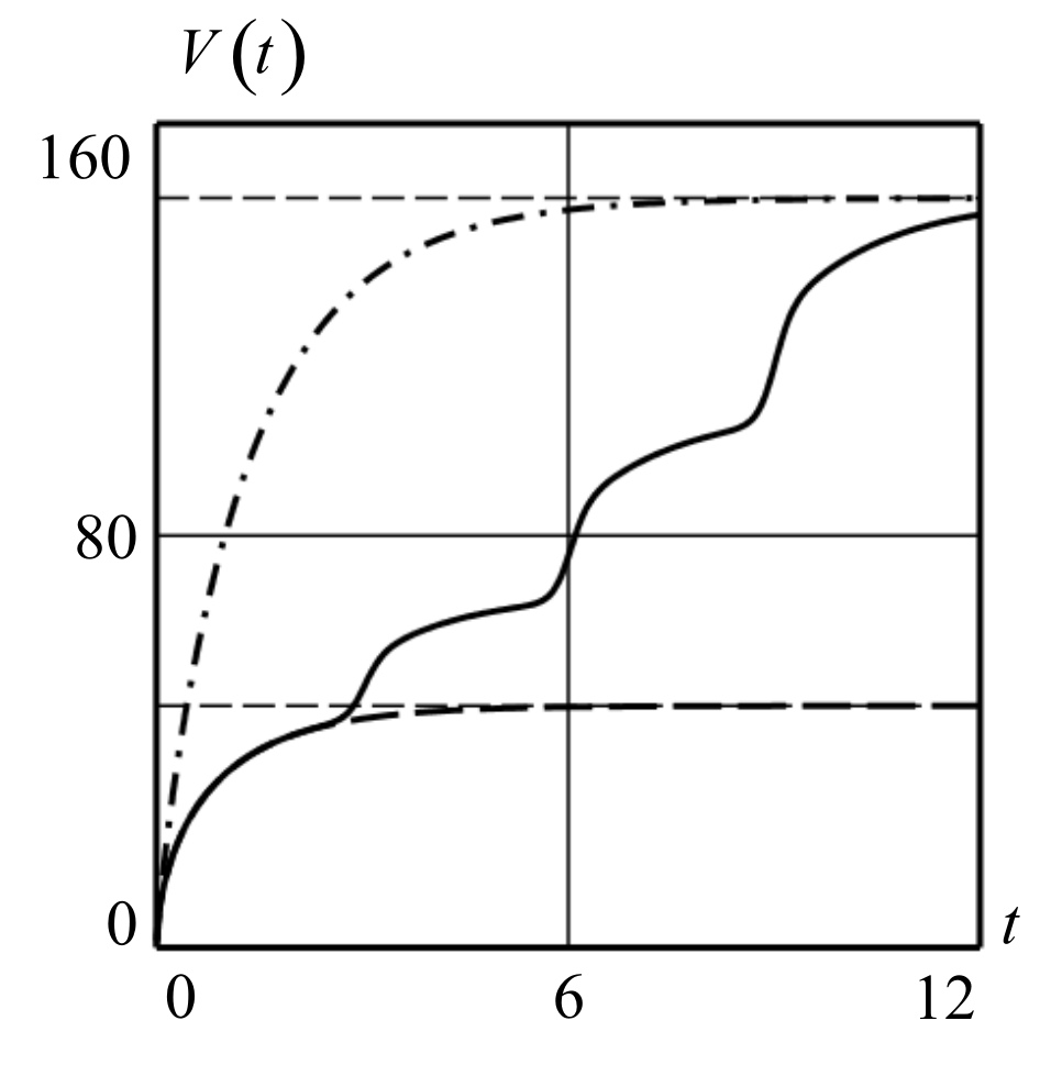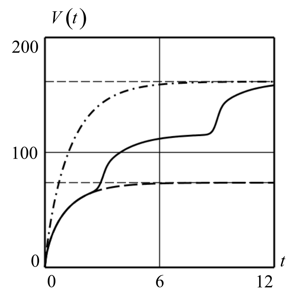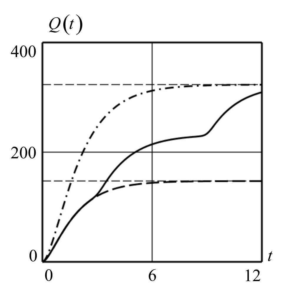 Fig. 6: Variants of graphs of functions of production volumes , constructed in accordance with numerical solutions of the Cauchy problem (20), (21) and the formula (18). The dashed line corresponds to the first option, the solid line corresponds to the second option, and the dashed line corresponds to the third option.