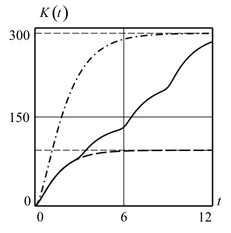 Fig. 5: Variants of graphs of functions of production factor volumes , constructed in accordance with numerical solutions of the Cauchy problem (25), (26). The dashed line corresponds to the first option, the solid line corresponds to the second option, and the dashed line corresponds to the third option.