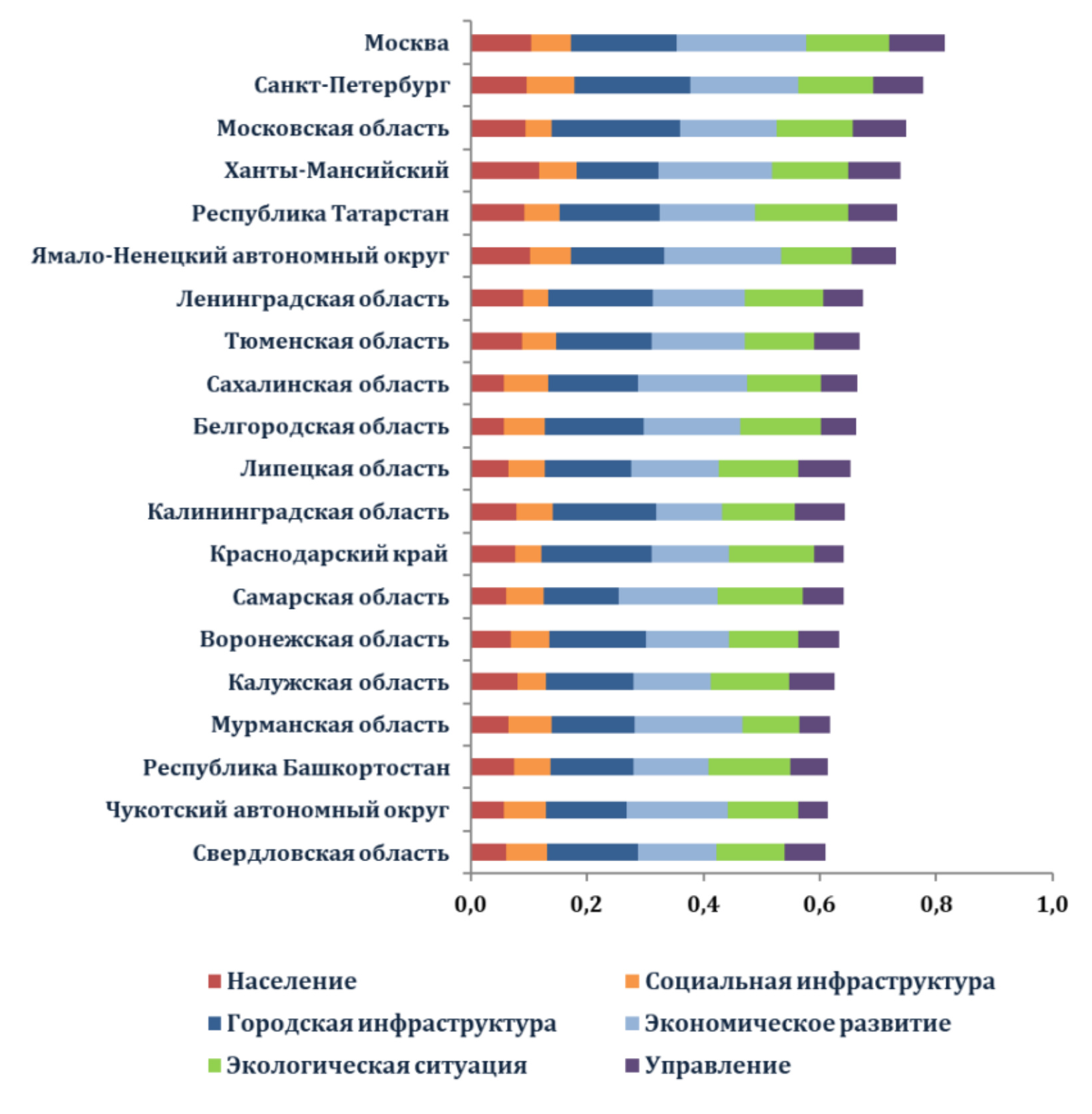 Первые три места занимают Москва, Санкт-Петербург и Московская область. Неудивительно, что по результатам анализа регионов вышеперечисленные стали лидерами. Их место определяет их вес в экономике России, что объясняет большие возможности по устойчивому развитию.