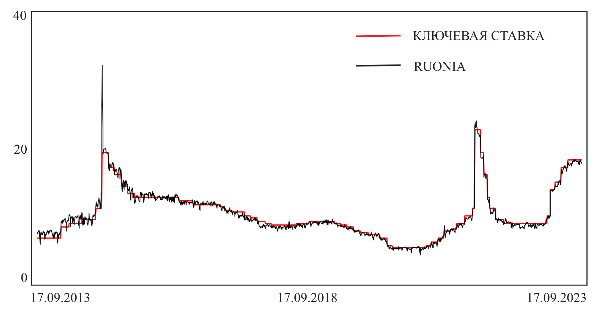Как было показано выше, ключевая ставка Центрального банка РФ также влияет на значения RUONIA, поскольку банки-участники списка RUONIA заключают сделки на рынке, но в условиях действующей ключевой ставки. Можно сказать, что значения задают базу для модели, к которой добавляются слагаемые, отражающие динамику .