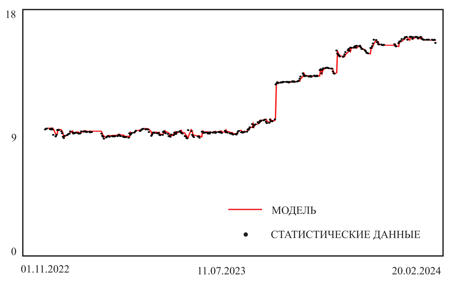 Полученная модель отражает зависимость исследуемого показателя RUONIA от значения ключевой ставки ЦБ РФ, денежной массы и от предыдущего значения самого результирующего признака – ставки RUONIA. На рис. 3 представлен результат моделирования в сравнении со статистическими данными для периода с ноября 2022 года по март 2024 года. Значительный временной интервал, используемый для апробации модели иллюстрирует ее качество, что подтверждается показателями точности.