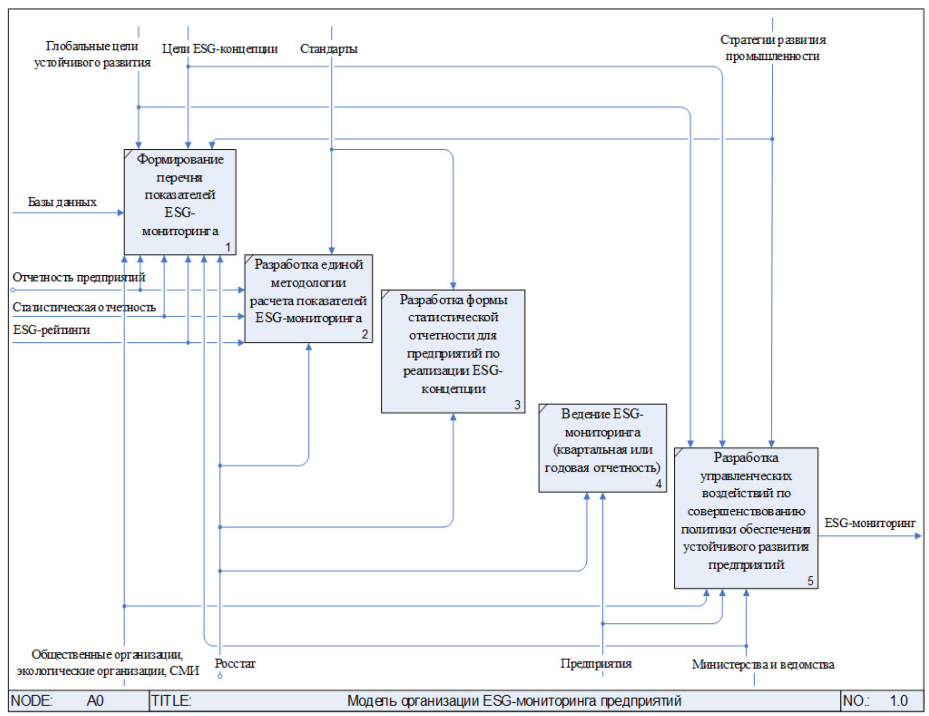 На рис. 1 представлена диаграмма декомпозиции организации ESG–мониторинга предприятий в нотации IDF0 в рамках реализации концепции устойчивого развития на государственном уровне, посредством организации единой формы статистической отчетности органами Федеральной службы статистики. Модель организации ESG–мониторинга предприятий включает следующую последовательность действий: