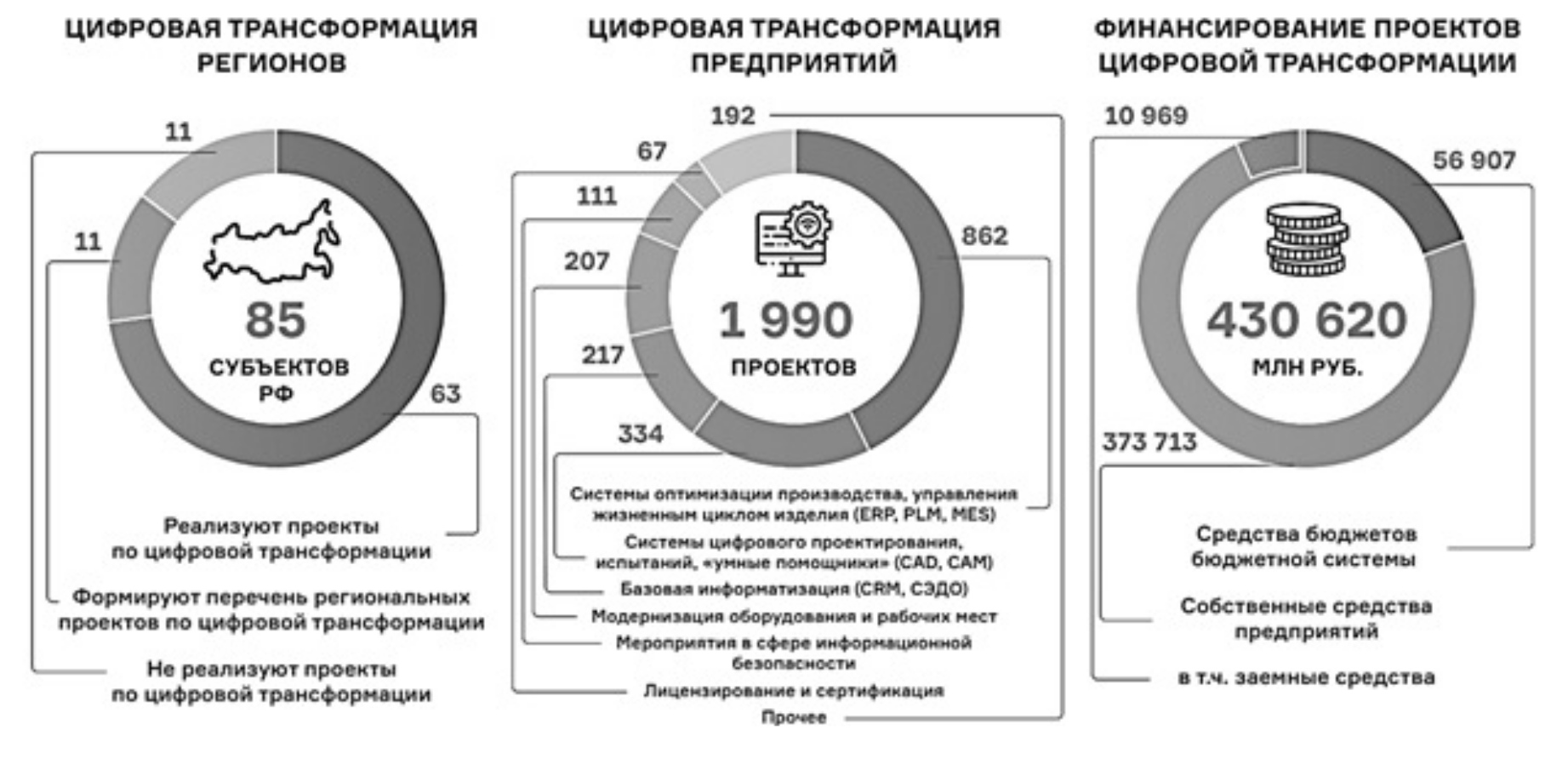 На рис. 3 видно, что 63 региона уже реализуют проекты по цифровой трансформации, в то время как 11 еще не начали эту работу. Основное внимание уделяется проектам, связанным с системами оптимизации производства, управления жизненным циклом изделий, системам цифрового проектирования, базовой информатизацией, модернизацией оборудования и рабочих мест, мероприятиями в сфере информационной безопасности, лицензированием и сертификацией, а также другим сопутствующим проектам. Финансирование этих проектов составляет 430 620 млн рублей. Данный рисунок подчеркивает важность активной цифровизации для повышения эффективности и конкурентоспособности предприятий, а также необходимость равномерного распределения усилий по цифровой трансформации среди всех регионов страны.