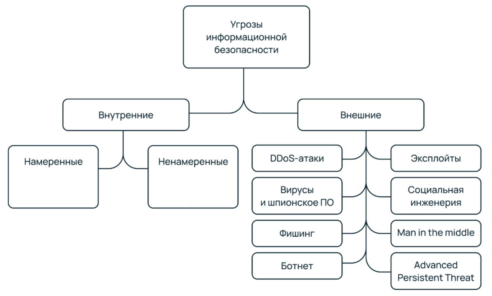 Одним из ключевых аспектов деятельности организаций в области информационной безопасности является внедрение и поддержание решений, направленных на защиту от потенциальных угроз, как внешних, так и внутренних. Основные направления угроз представлены на рис. 1.