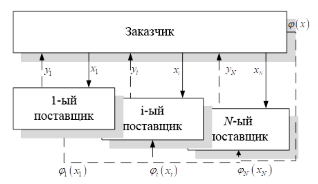 Из схемы следует, что каждый поставщик получает компенсацию при реализации планового задания заказчика, что позволяет обеспечить им максимальную величину прибыли.