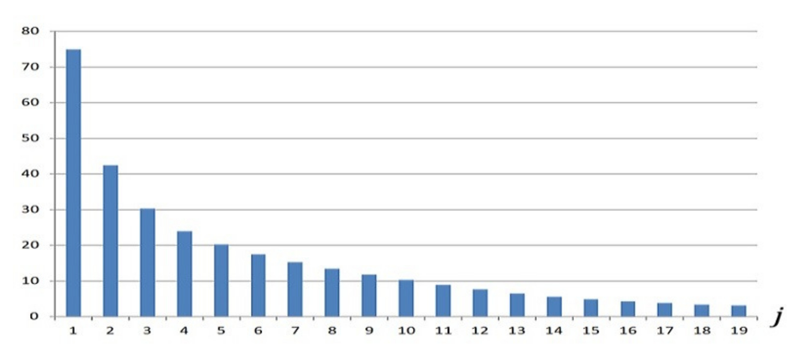 Проверим свойства 1э и 2э для временного ряда акций компании «Инарктика» (Рис. 1). Здесь (т.е. 90 уровней ряда), , . Последовательность изображена на диаграмме (рис. 2). Визуально наблюдается стремление к нулю. Последовательность визуально сходится к нулю значительно быстрее, чем . Таким образом, случайный процесс котировок акций компании «Инарктика» можно считать слабо эргодическим.