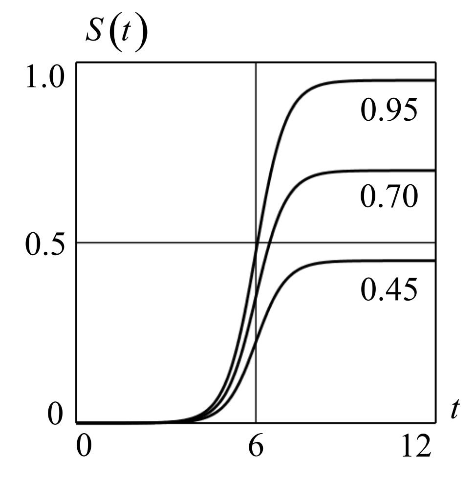 На рис. 1 показаны варианты кривых логистической функции (6) для различных уровней максимальных долей перерабатываемой продукции .