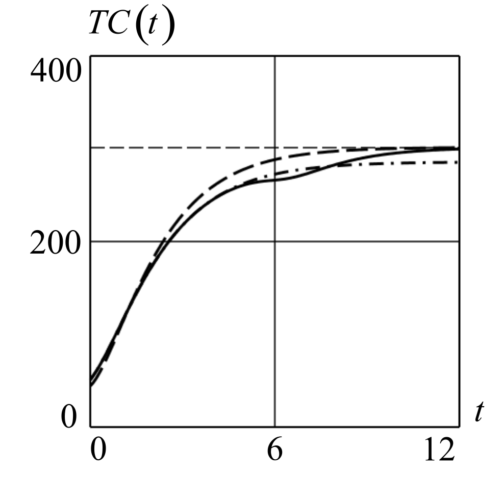 Fig. 3: Variants of growth curves of cost volumes , constructed based on the results of the numerical solution of the Cauchy problem (18) and formula (16). The dashed line corresponds to the first variant, the dashed – dotted line corresponds to the second variant, the solid line corresponds to the third variant.