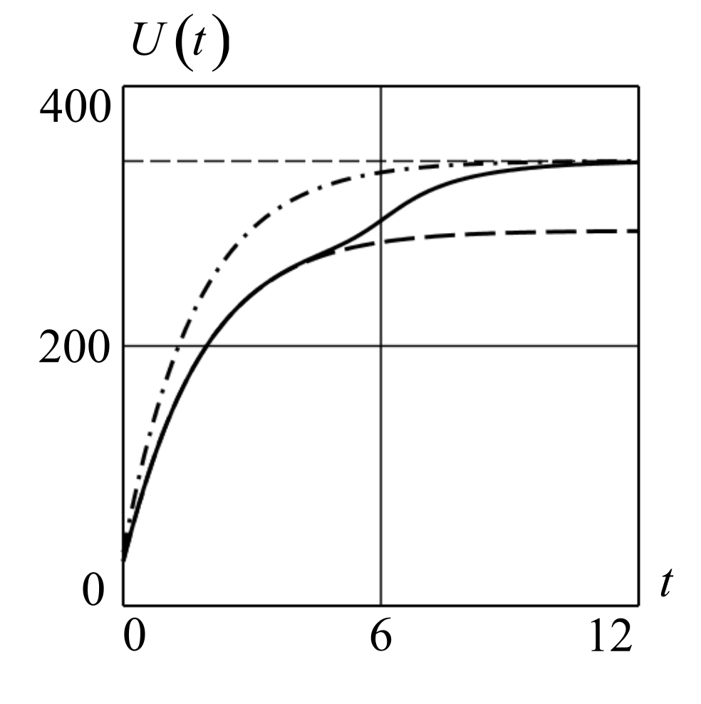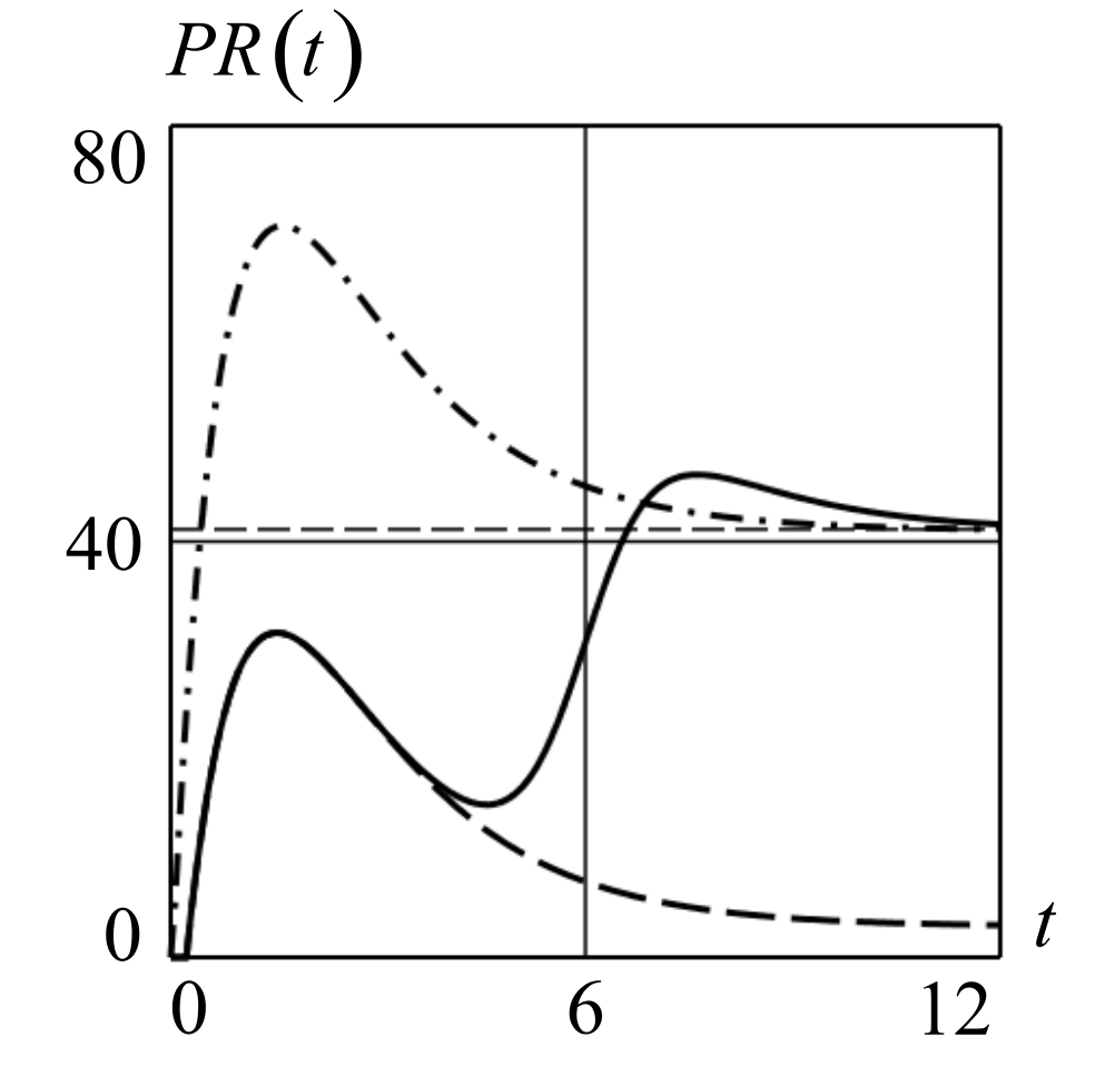На рис. 4 представлены три варианта кривых роста объемов выпуска продукции , построенных по результатам численного решения задачи Коши (18) и формулы (15). В первом варианте переработка отходов не производится , во втором варианте переработка отходов производится самого начала производственного процесса , в третьем варианте переработка отходов производится на временном интервале с центром в точке и радиусом .