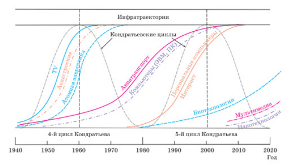 Рис. 2: Диффузия инноваций вдоль подъемов циклов Кондратьева.
