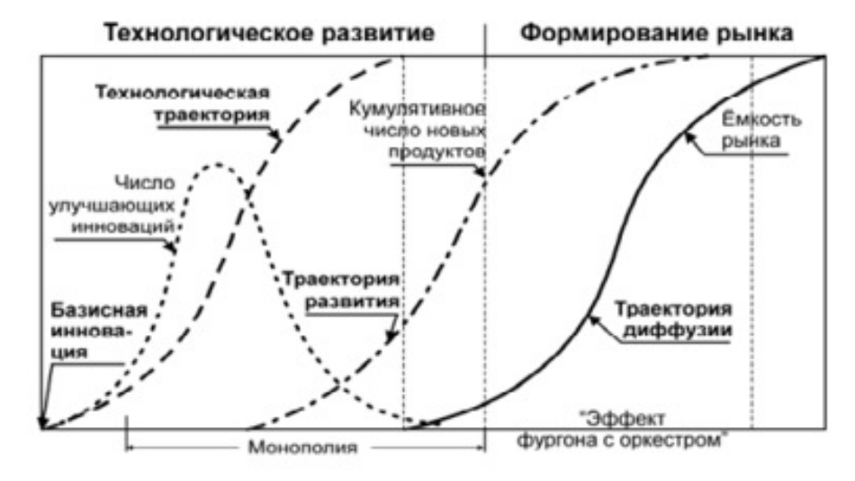 Технологическая траектория – это совокупность «ключевых» технологий, которые возникли в результате научного открытия или технического изобретения. Траектория разработки – это совокупность продуктов, которые были получены путем применения ключевых технологий. По мнению М. Хироока, траектория разработки является самой важной, так как именно здесь происходит внедрение технологического знания, создание венчурных предприятий и дальнейшая коммерциализация инновации. Структура инновационной парадигмы представлена на рис. 3.