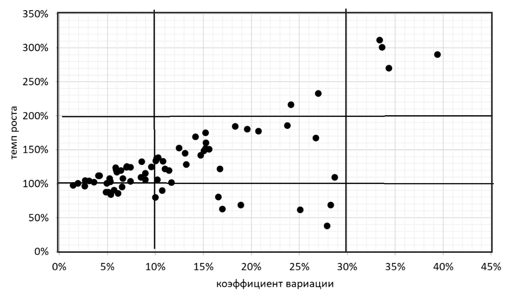 - Предложен метод классификации отраслей экономики на основании значений коэффициента вариации и темпов роста исследуемого показателя отрасли.