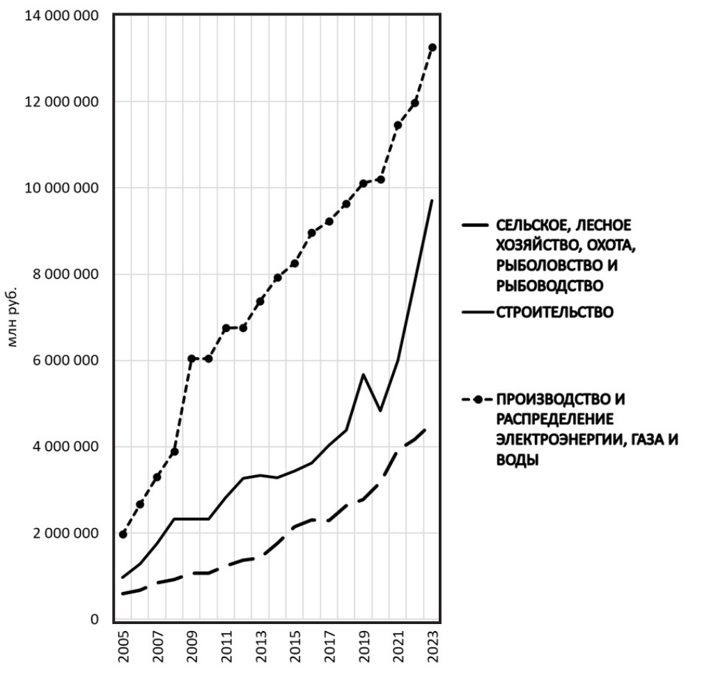 Следует отметить существенные отклонения, отображенные на диаграмме рисунка 9: строительство показало темп роста 241 %, деятельность в области информации и связи - 249 % за исследуемый период. На рис. 10 графики оборота организаций за 2005 – 2023 года наглядно показывают существенные различия в динамике показателя разных отраслей, которые в агрегированном показатели не отображаются.