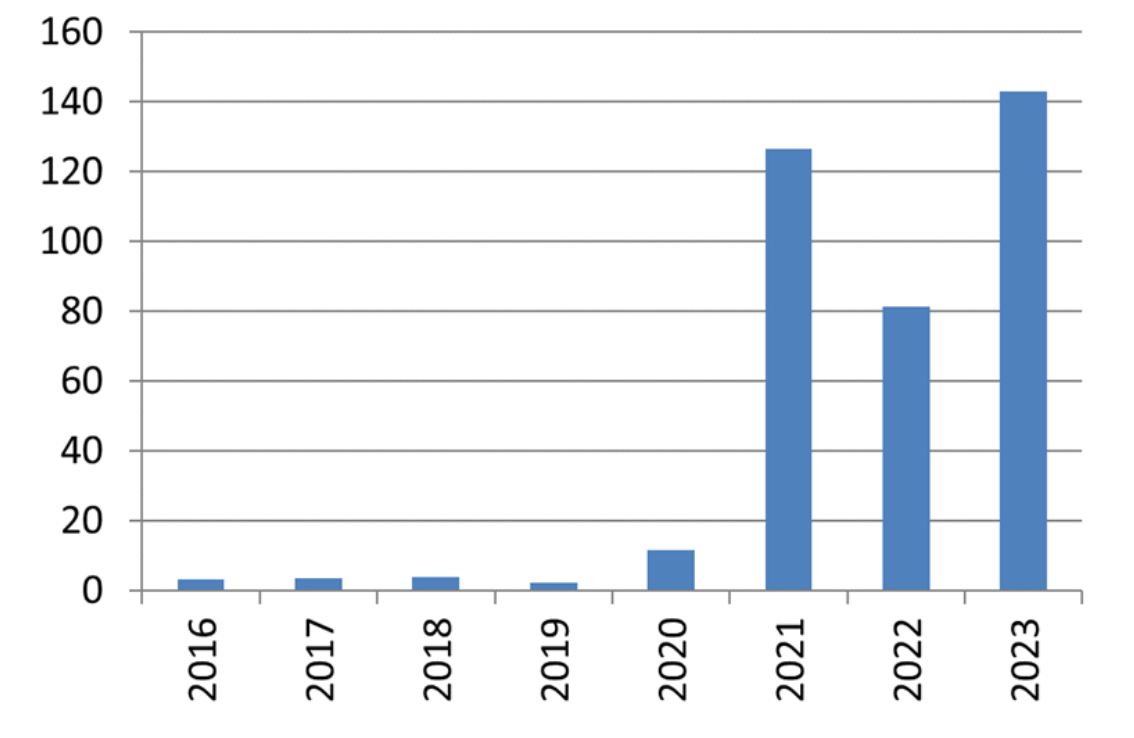 На указанных графиках (рис. 1–3) видно, что объем размещенных ESG и GSS+ облигаций в мире в 2023 году начинает расти, и в 2024 году, предположительно, будем наблюдать стабилизацию или умеренный рост. При этом динамика объема размещенных зеленых облигаций в мире в 2023 году продолжила падение, но мы можем предположить, что в 2024 год у перейдет к умеренному росту.