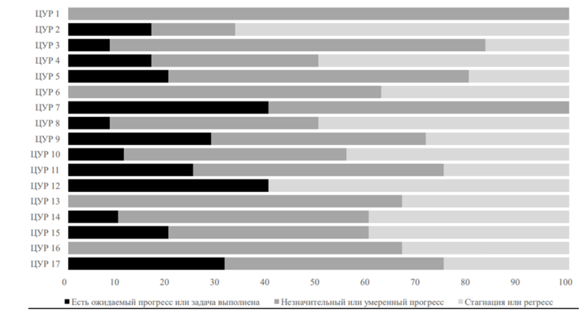 На рисунке 4 представлены данные о ЦУР по всем направлениям, из которых следует, что имеются значительные отставания от запланированного уровня. Лишь 17% задач и целей могут быть выполнены в полном объеме к 2030 году.