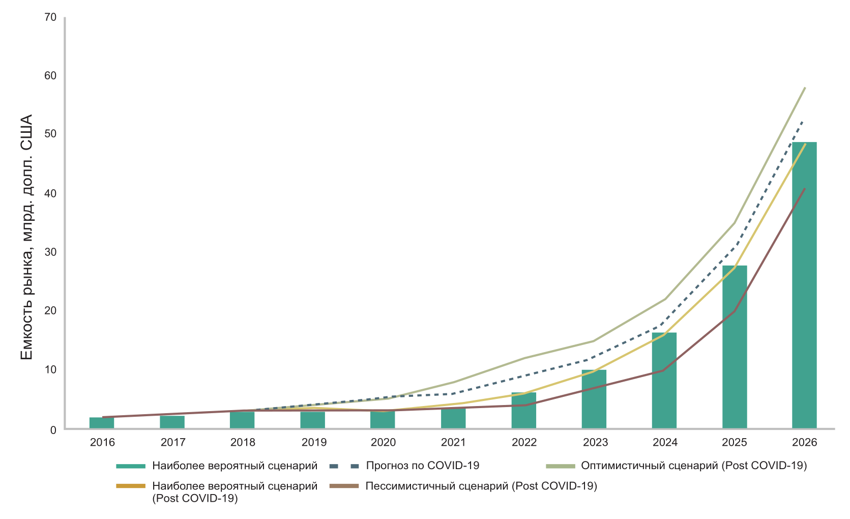 Рис. 1: Прогноз емкости рынка цифровых двойников до 2026 года с анализом воздействия COVID–19 [3].