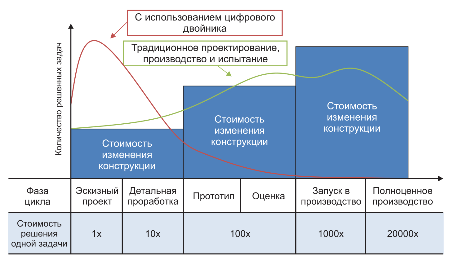 Покажем на рис. 2 стоимость изменения конструкции продукта с помощью цифрового двойника и при разработке традиционным способом.