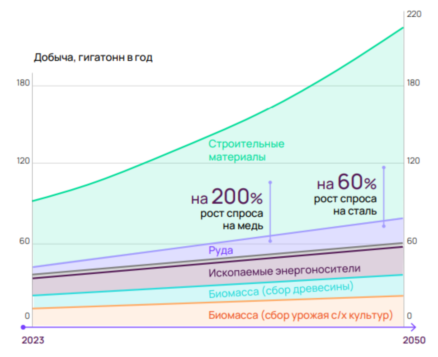 Первопричиной ежегодного прироста общего объема отходов служит ускорение потребления первичных ресурсов в различных отраслях экономики. При этом объем добычи необходимых первичных материалов к 2050 году увеличится вдвое, при условии той же линейной тактики по обеспечению растущего населения жильем, энергией, пищей и водой (Рисунок 1).